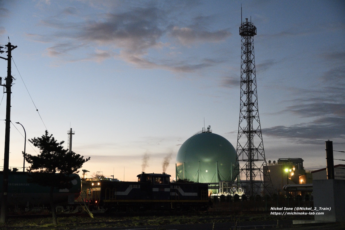 仙台北港駅に着いて入換。後ろには仙台市ガス局のタンクが見える。